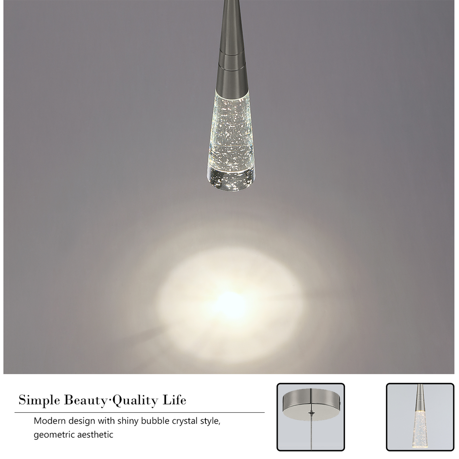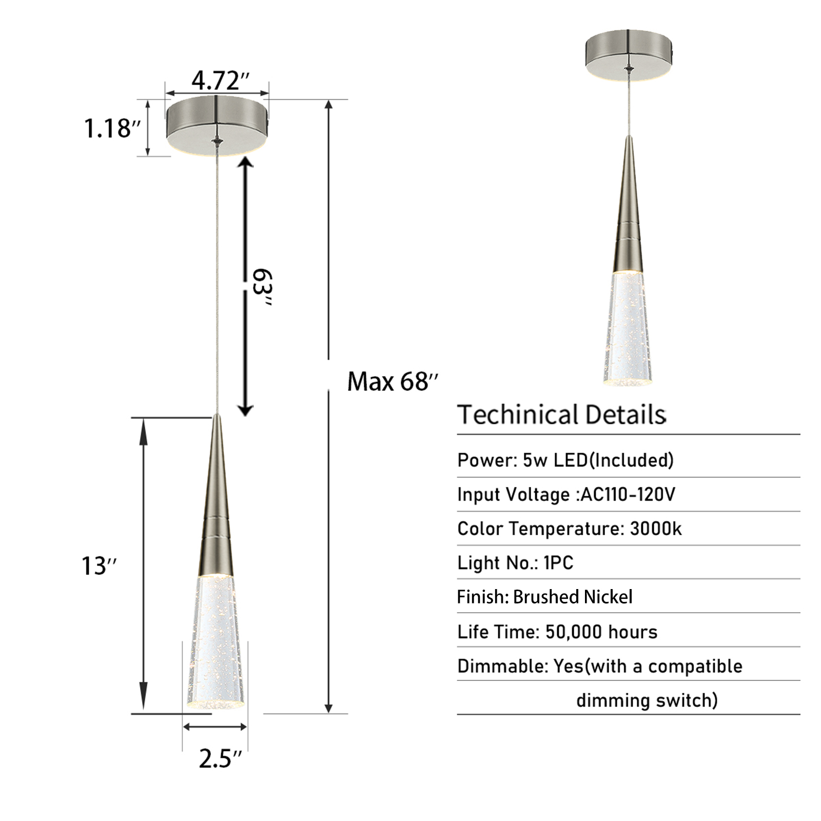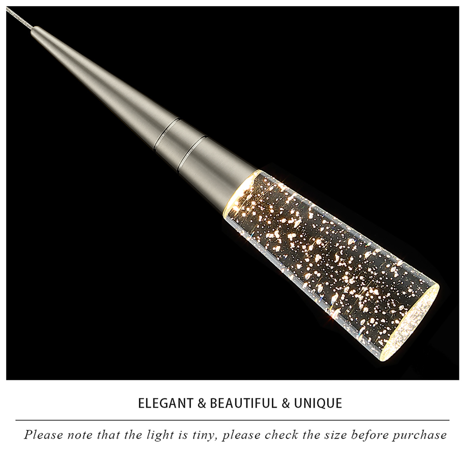 【PRETTY & MODERN】 This single mini pendant light fixture has a bubble crystal with brushed nickel finish which is a beautiful and well-made light. The light gets refracted beautifully by the bubbles giving it a unique appearance. The contemporary look makes it ideal for kitchen, over island, above the sink or bar counter, bedroom bedside and bathroom. Please note that it's more for ambient/mood lighting than to provide light to a room
