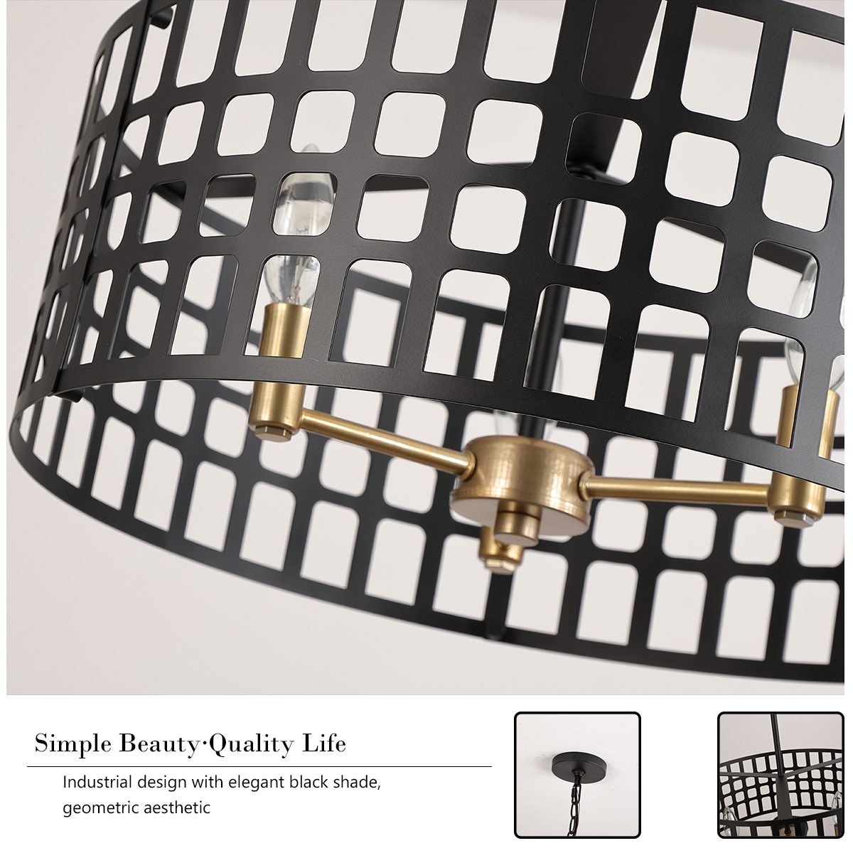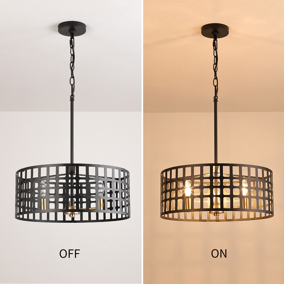 - OPEN DESIGN: This drum chandelier features a unique black metal shade and gold arms, beautiful but simple. Without light diffuser on the bottom, it's easy to clean and change bulbs. This hanging lamp will beautifully illuminate your home, suiting multiple decors like mid-century modern & farmhouse.