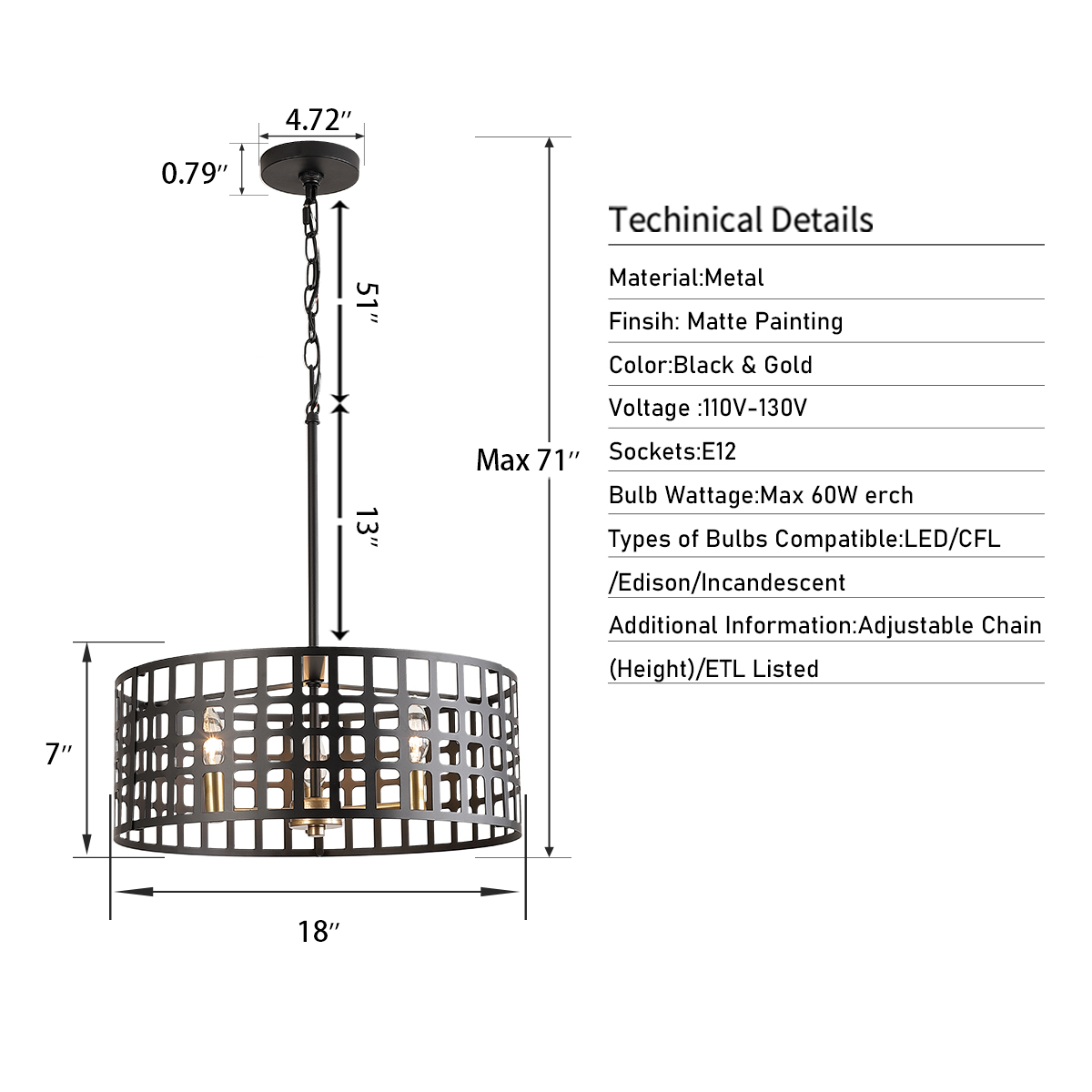 - DIMENSIONS: Chandelier: 71" (H) x 18" (D), Canopy: 0.79" (H) x 4.72" (D). Shade: 7" (H) x 18" (D). Includes 51" chain and 13" downrods for desired hanging height. Minimum/Maximum: 21" - 71"