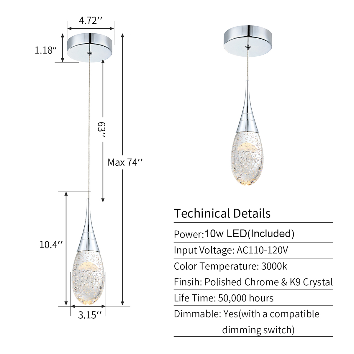 - 【Dimmable】This crystal pendant light is fully dimmable using a compatible dimmer. Integrated 5-watt warm white 3000k LED, with the brightness of 500lms, which can illuminate up to 50,000hrs. Compared to traditional incandescent bulbs, LED lights driver with stable quality, more environmentally friendly, more light brightness with less energy consumption for you(50% less energy than CFL bulbs).