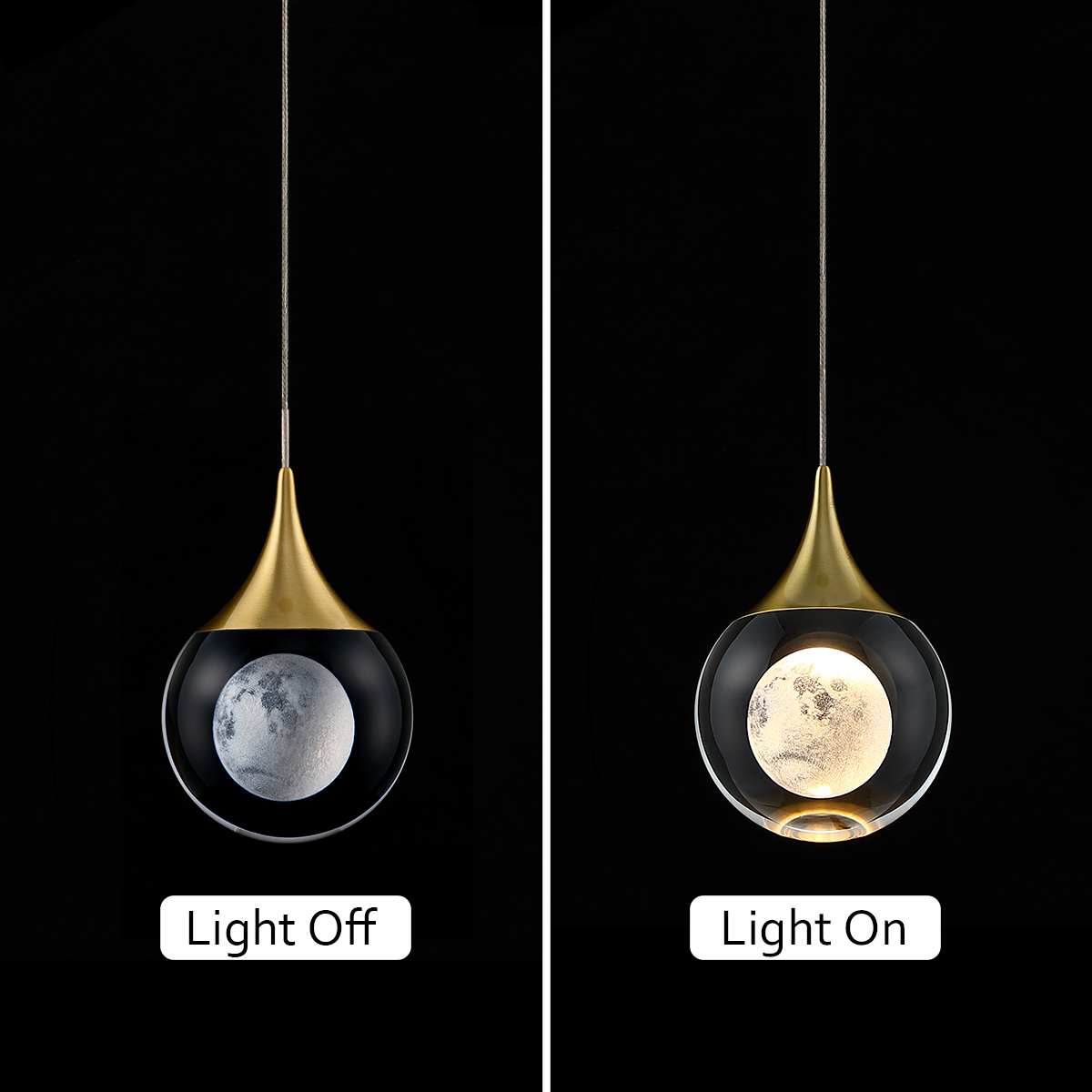 - This mini pendant light is made of high-quality crystal and chrome plated metal. With a 3D moon inside the crystal, it's beautiful when the light is on, you will see the shining moon which can bring an elegant and unique decoration in any room. Please note that the size is small, so it's more for ambient/mood lighting than to provide light to a room, which can add a subtle light that makes the room glow.