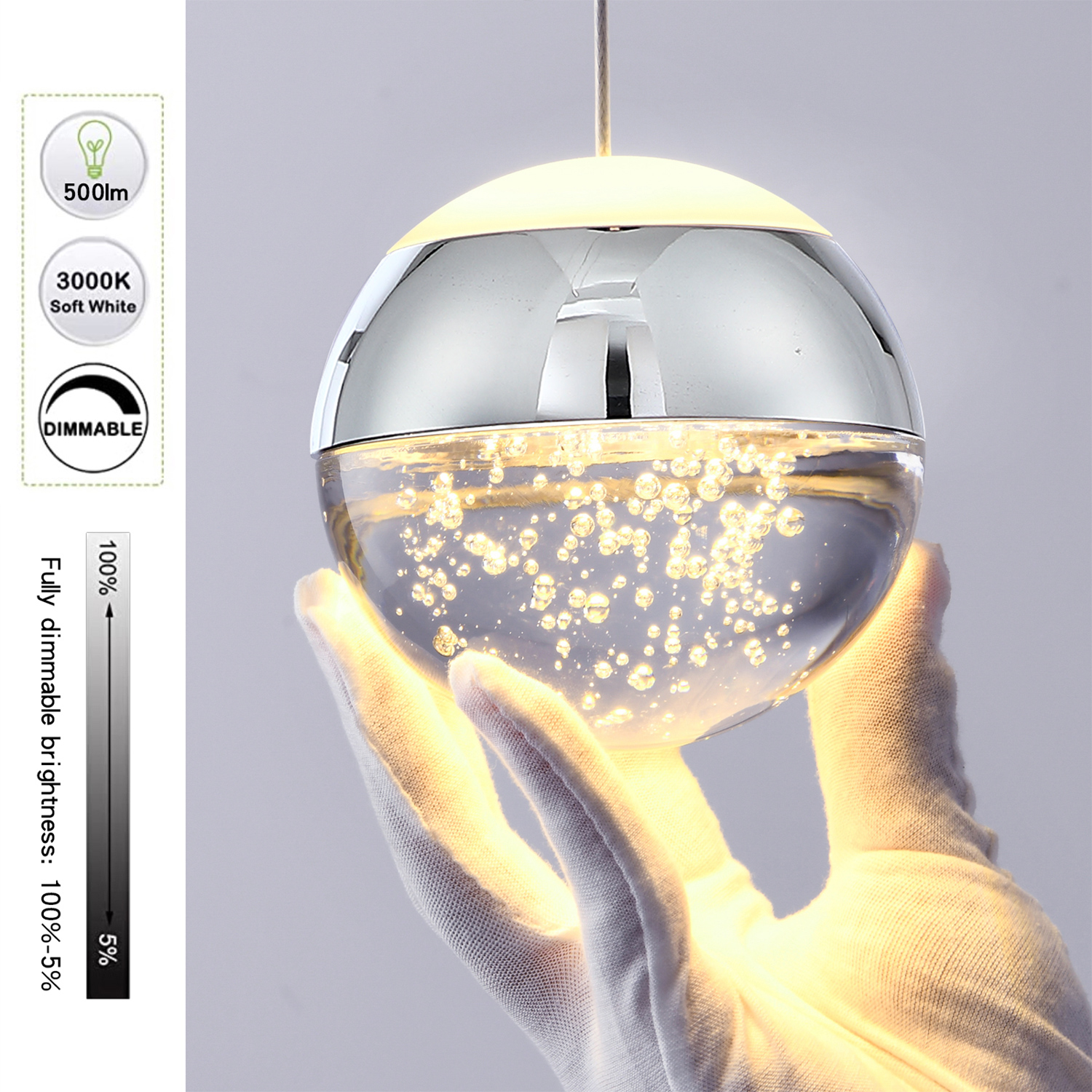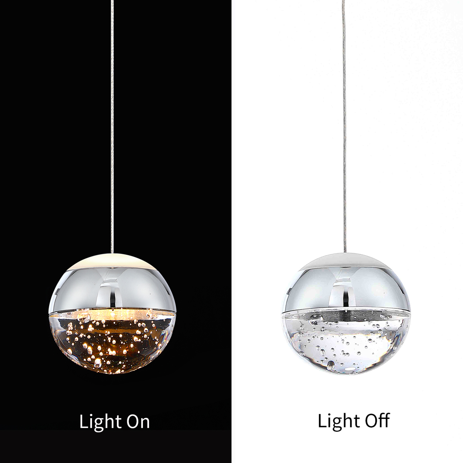 - Attractive and Versatile: When the light is on, this modern crystal pendant light looks really nice and creates nice reflection through the bubble inside of it, perfect for decoration in kitchen island, bathroom, above the sink or bar counter and bedroom bedside. Please note that it's an accent light, not designed to light up a room.