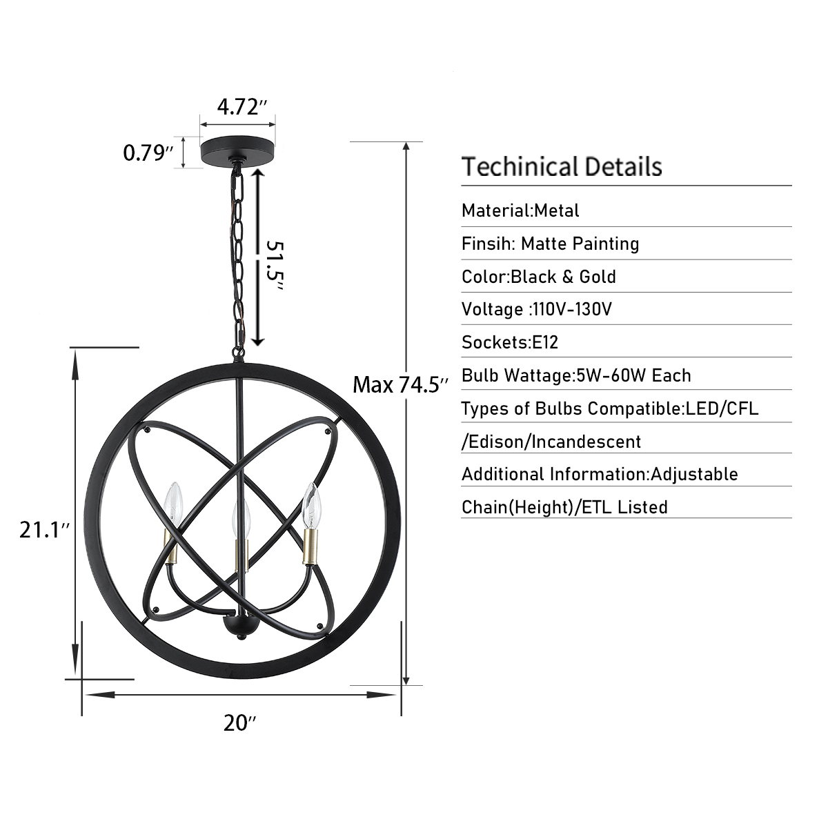 - 【DIMENSIONS】Chandelier: 21" (H) x 20" (D), Canopy: 0.79" (H) x 4.72" (D). Includes 51" chain for desired hanging height. Minimum/Maximum: 22" - 74". Sloped ceiling compatible.