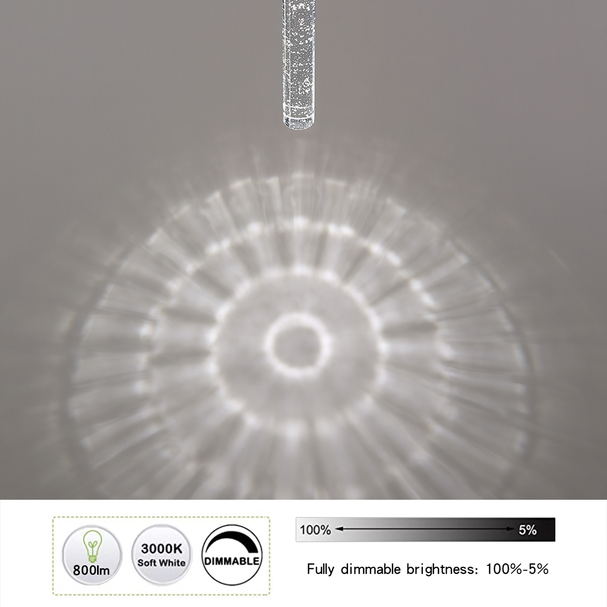 - 【PRETTY & MODERN】 This single crystal pendant light fixture has a bubble crystal cylinder with brushed nickel finish which is a beautiful and well-made light. The light gets refracted beautifully by the bubbles giving it a unique appearance. The contemporary look makes it ideal for kitchen, over island, above the sink or bar counter, bedroom bedside and bathroom. Please note that it's more for ambient/mood lighting than to provide light to a room.